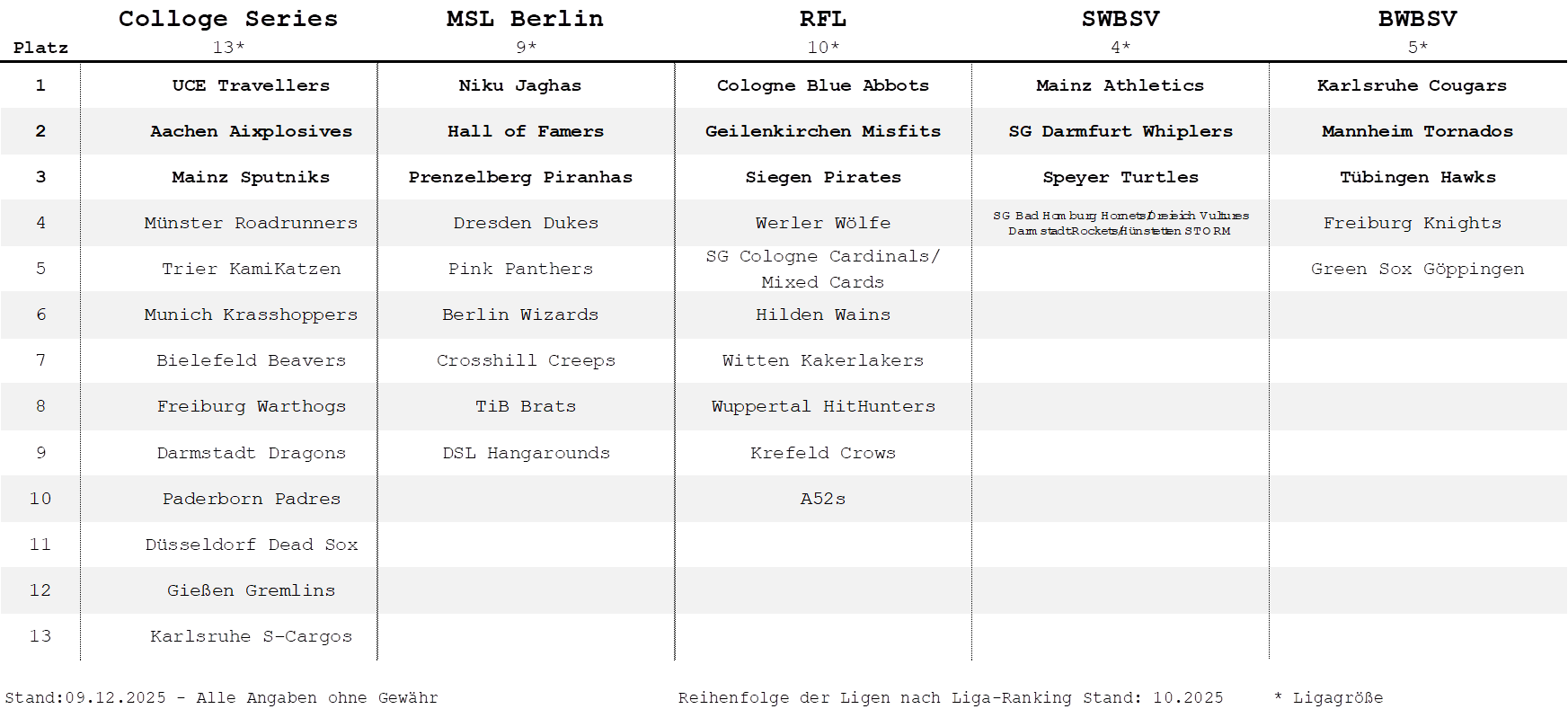 in diesem Jahr die College Series, die Mixed Softball League Berlin, die Ruhr Fun Liga, der Südwestdeutsche Baseball- und Softball Verband sowie der Baden-Württembergische Baseball- und Softballverband. Die Bayrische Softball Liga hat seit Jahren nicht mehr gemeldet und neue Meldungen liegen uns zur Zeit noch nicht vor.